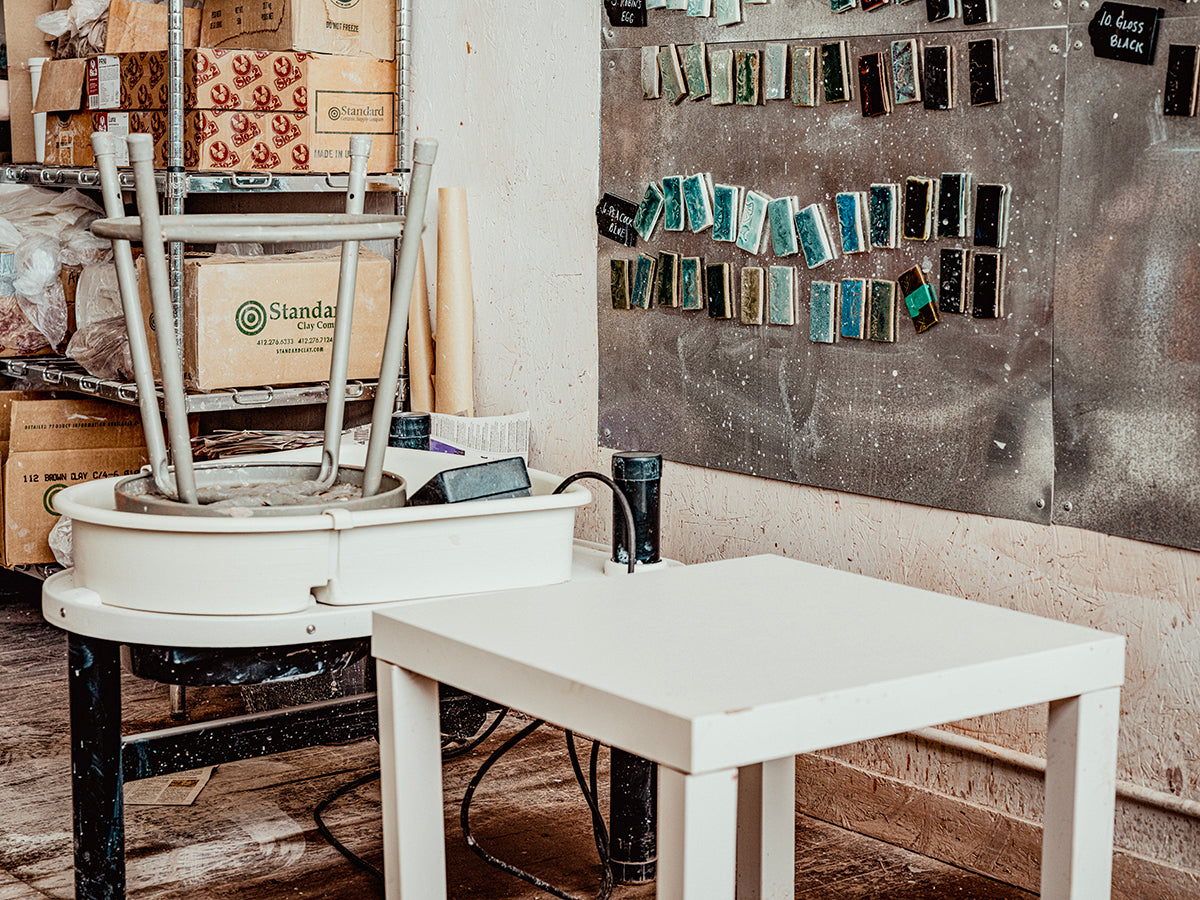 Members pay a monthly fee + clay and the studio provides a semi-private space with a personal shelf, access to community space, four potter's wheels, two large work tables, over two dozen glazes and more.