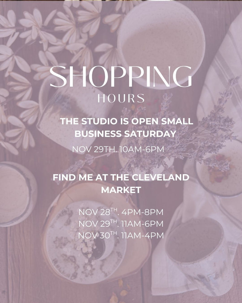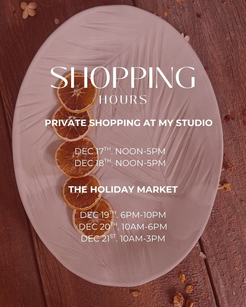 The studio is open 10am-4pm Monday, Tuesday, Wednesday & Friday for pick up of online orders.