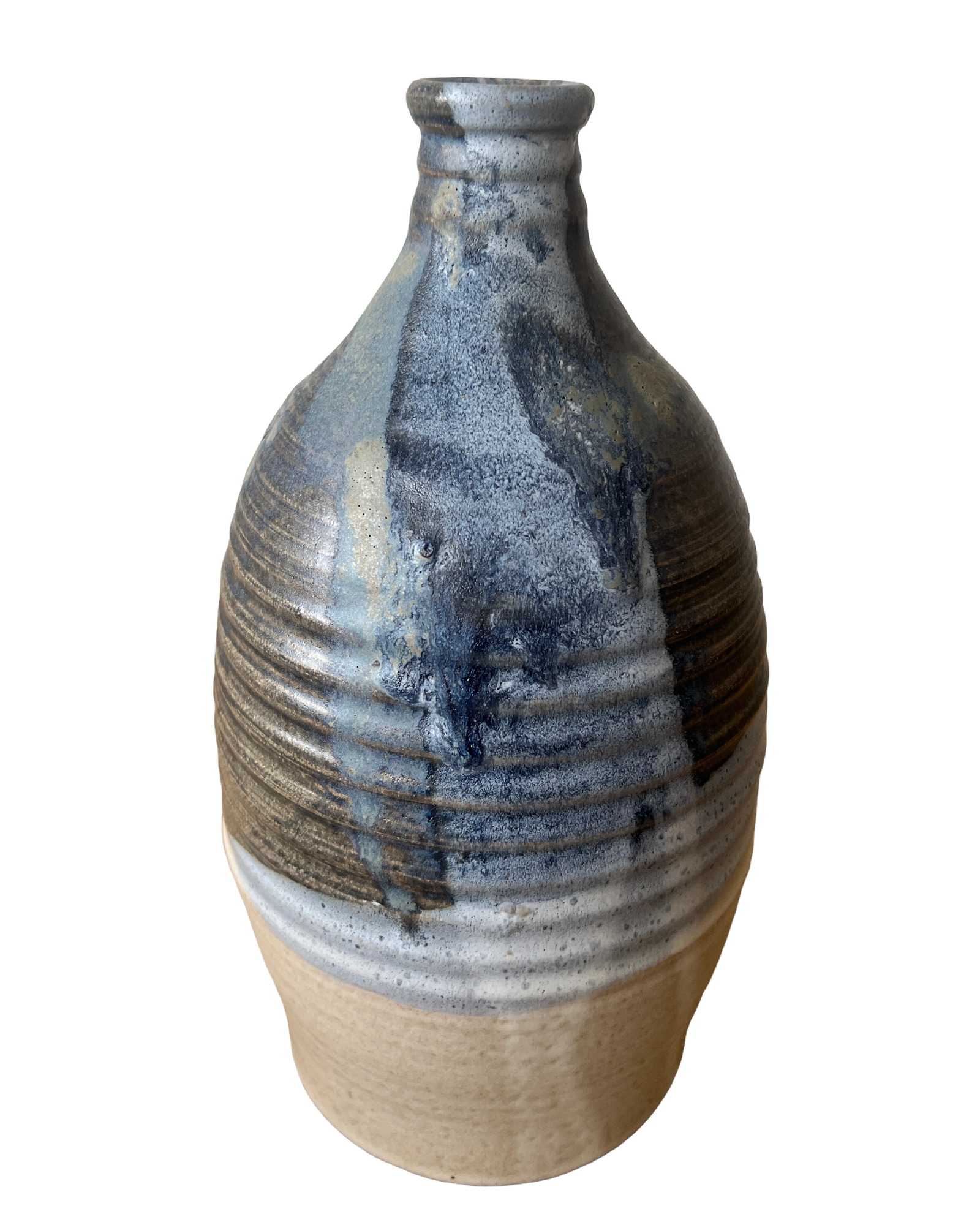 This vase is a sizeable piece crafted from rich brown stoneware clay. Its glaze in salt white glaze and then that was double dipped wood ash glaze with cobalt blue added. Wood ash glazes are meant to be thicker and sometimes even a little "crusty". Its unpredictable making each piece truly a one of a kind piece that can't be duplicated. Snag this while you can! It is watertight.