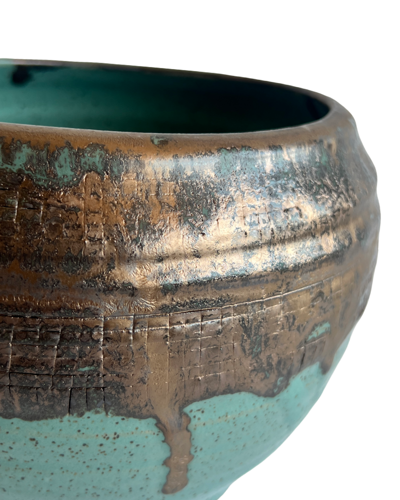 This piece is great as a stand alone vessel but its 100% functional so you could also use it as a flower pot or planter. It was wheel thrown with brown stoneware, hand carved then finished in our antique gold and echeveria teal glaze.