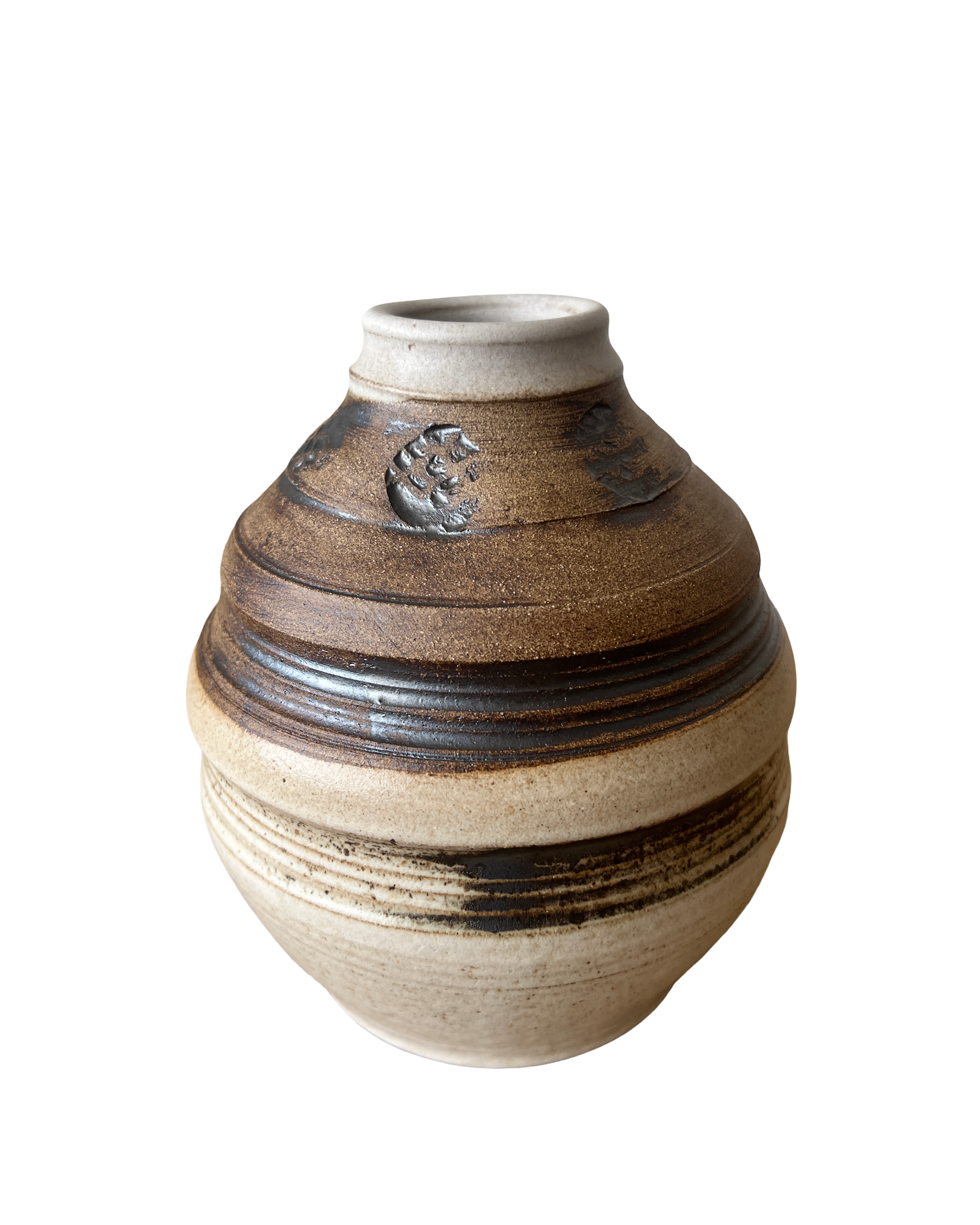 This vase was wheel thrown, carved and stamped using a toasty brown stoneware clay. It is glazed with a matte white, beige and bronze with one portion left unglazed to showcase this rich clay body. Its water tight and perfect for any room in your home.