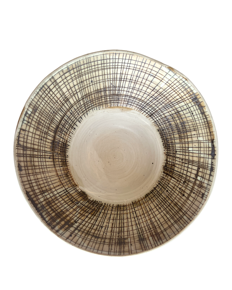 This ceramic bowl was crafted in gray stoneware clay then hand carved. A bronze glaze was inlaid in the lattice work carvings then it was finished in our salt white glaze. The result is an off white finish. It also has a lightly carved asymmetrical rim. Due to the pieces form and size I recommend hand washing this item.