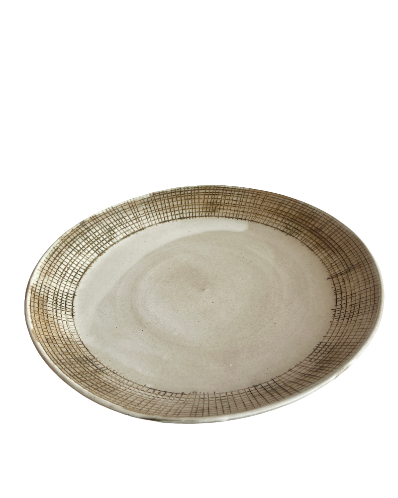This platter is made to be use. Its food safe but it still makes a statement in a room on display. It was wheel thrown using brown stoneware glaze. It was then hand carved. A bronze glaze was inlaid into the carvings. It is finished in our sand glaze. Due to the size of this piece I recommend hand washing it.