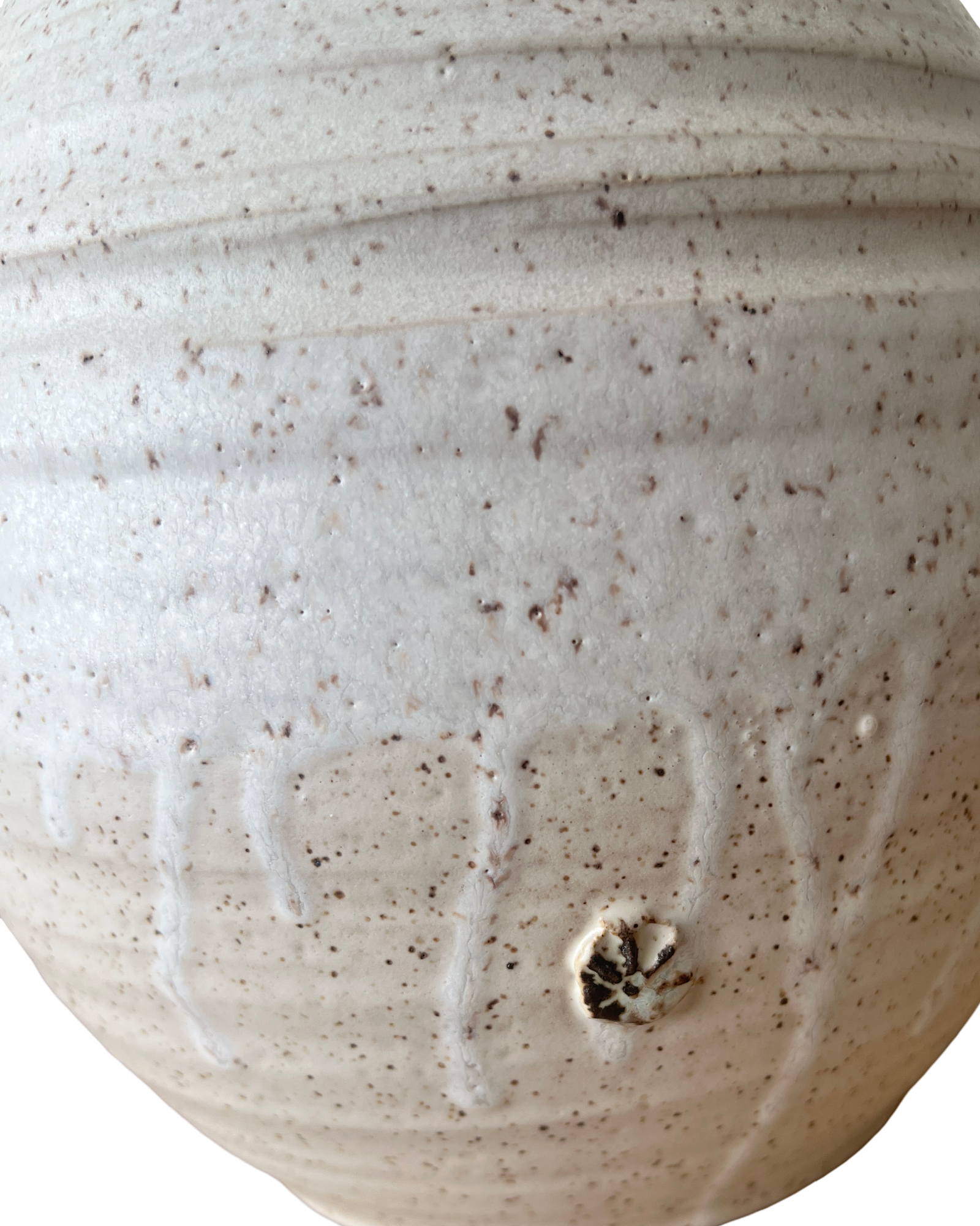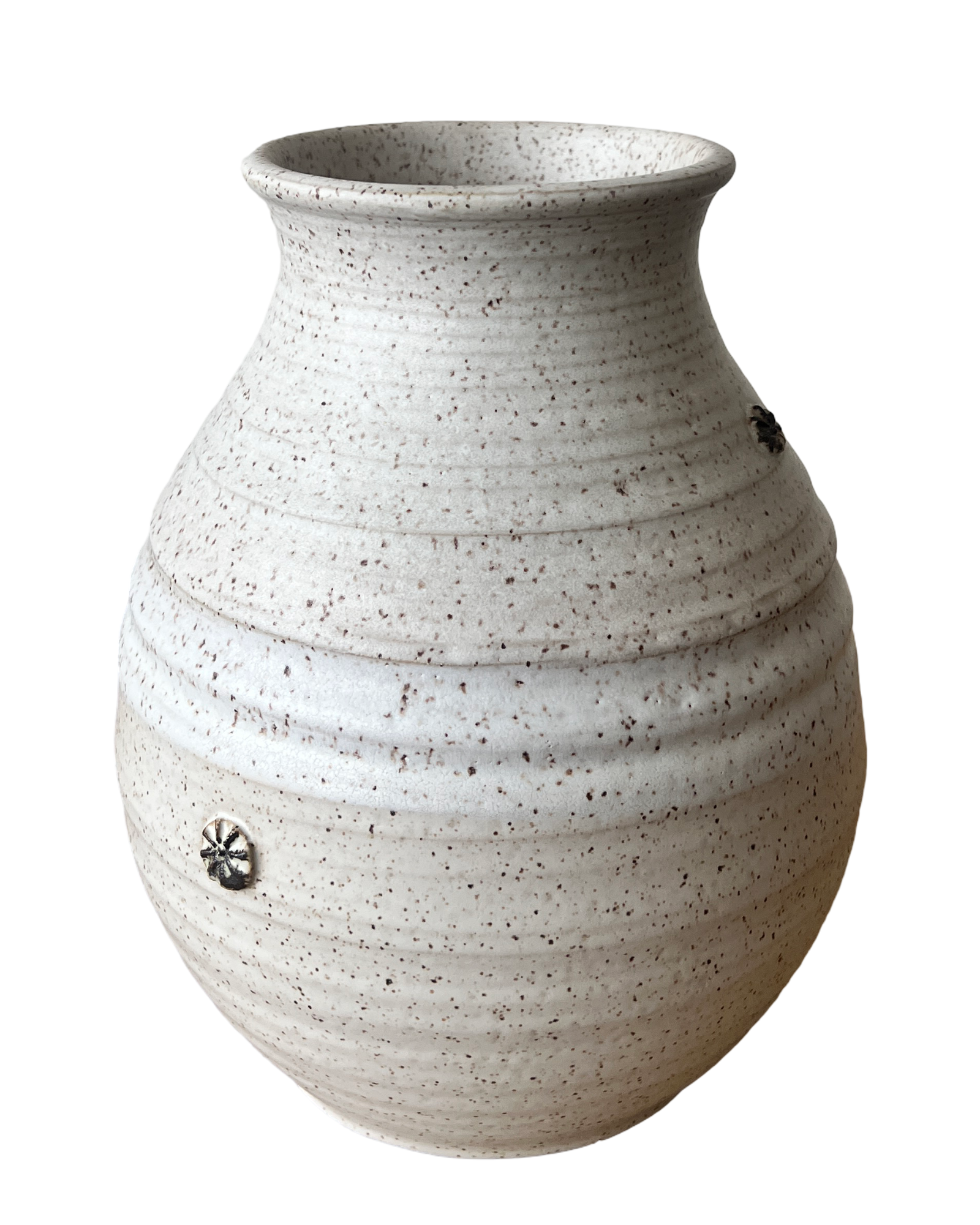 This is a sizeable vase meant to make a statement. It was wheel thrown and stamped. There are light carvings to enhance those wheel thrown grooves. This vase is water tight. The glaze is mist which is an almost pink white. There are three little stamps along the surface that have a hint of bronze.