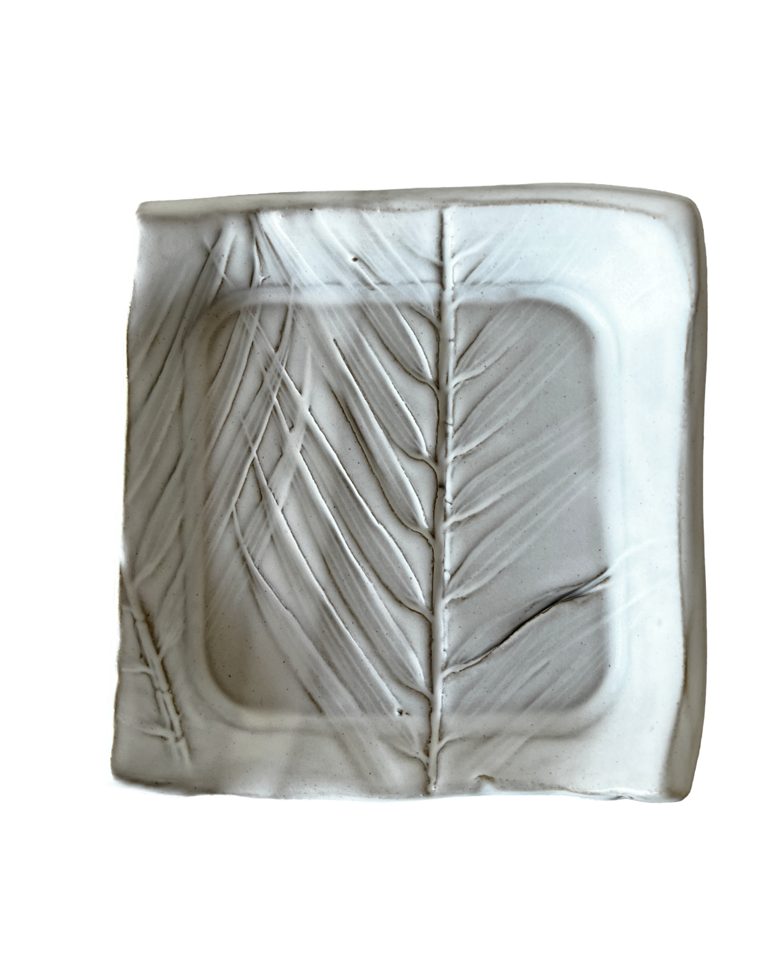 This tray was hand cut and pressed with a fern leaf. The clay gray stoneware (used in the Palo Santo Collection) with a salt white glaze that gets warmer beige tones due to the texture of each piece. This plate is 5.5 inches wide x 1.5 inches tall. I use these for soap dishes, spoon rests, sushi, appetizers and catch all plates for jewelry.