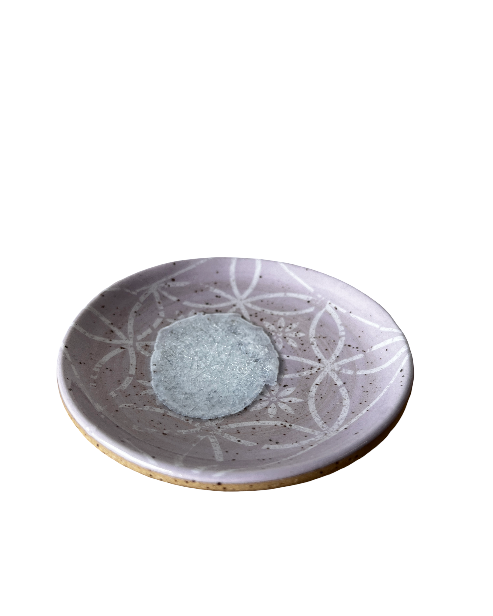 Each little dish is completely different. This style is crafted on speckled brown stoneware that was wheel thrown. It was then decorated in a soft lavender slip, white decal with tile pattern then finished in a gloss clear glaze and melted glass. Due to the glass its not an item meant for food.