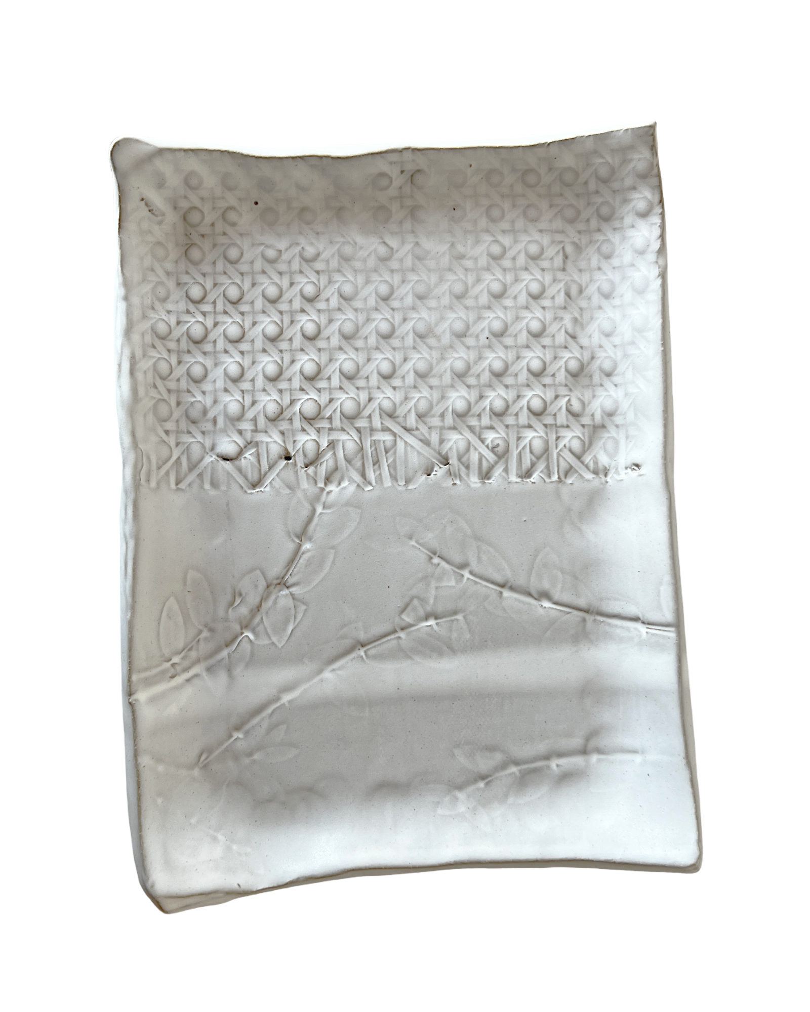 This tray was hand cut and pressed with a fern leaf. The clay gray stoneware (used in the Palo Santo Collection) with a salt white glaze that gets warmer beige tones due to the texture of each piece. This plate is 9 inches wide x 7 inches long x 1 inch tall. Microwave and dishwasher safe.