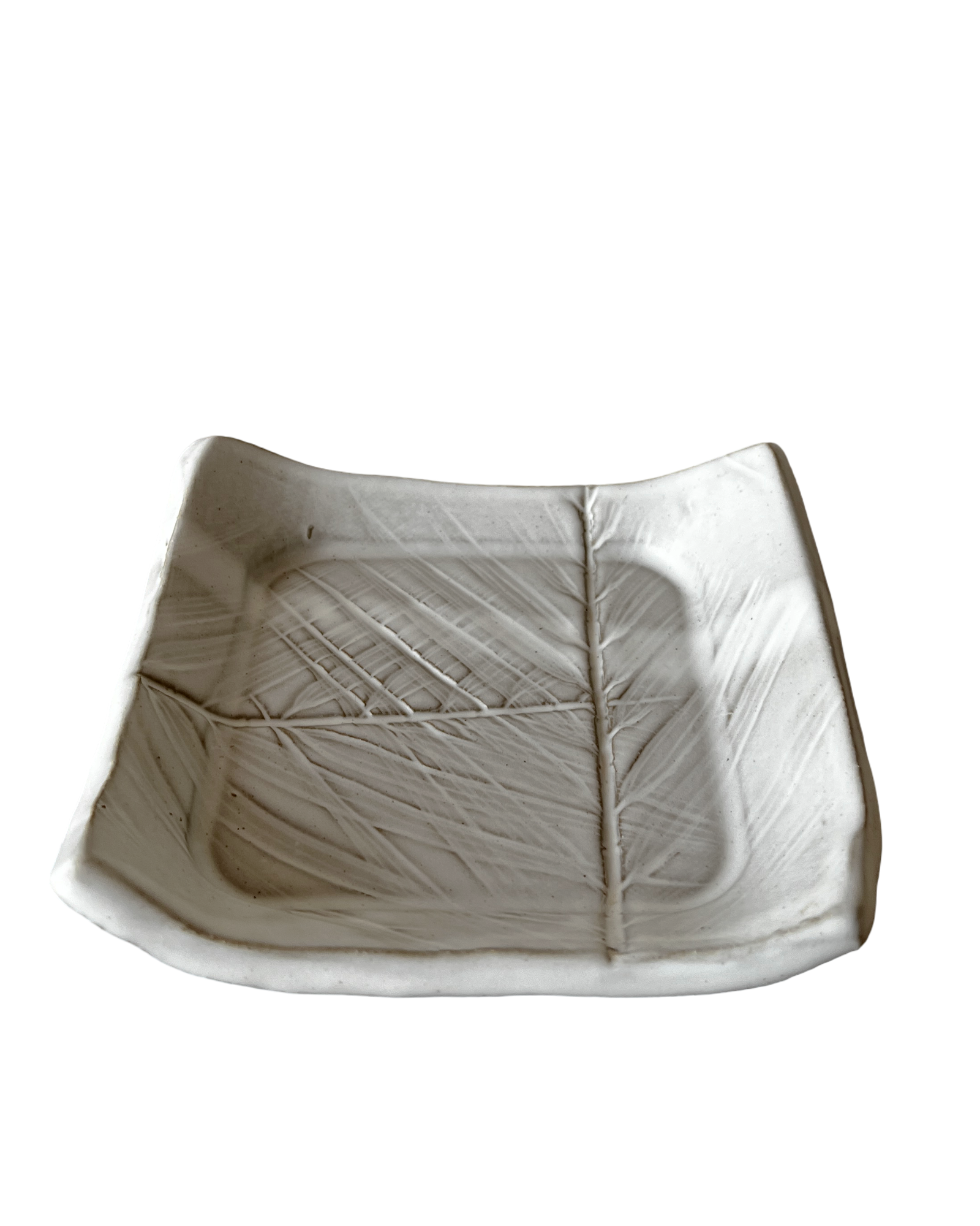 This tray was hand cut and pressed with a fern leaf. The clay gray stoneware (used in the Palo Santo Collection) with a salt white glaze that gets warmer beige tones due to the texture of each piece. This plate is 5.5 inches wide x 1.5 inches tall. I use these for soap dishes, spoon rests, sushi, appetizers and catch all plates for jewelry.