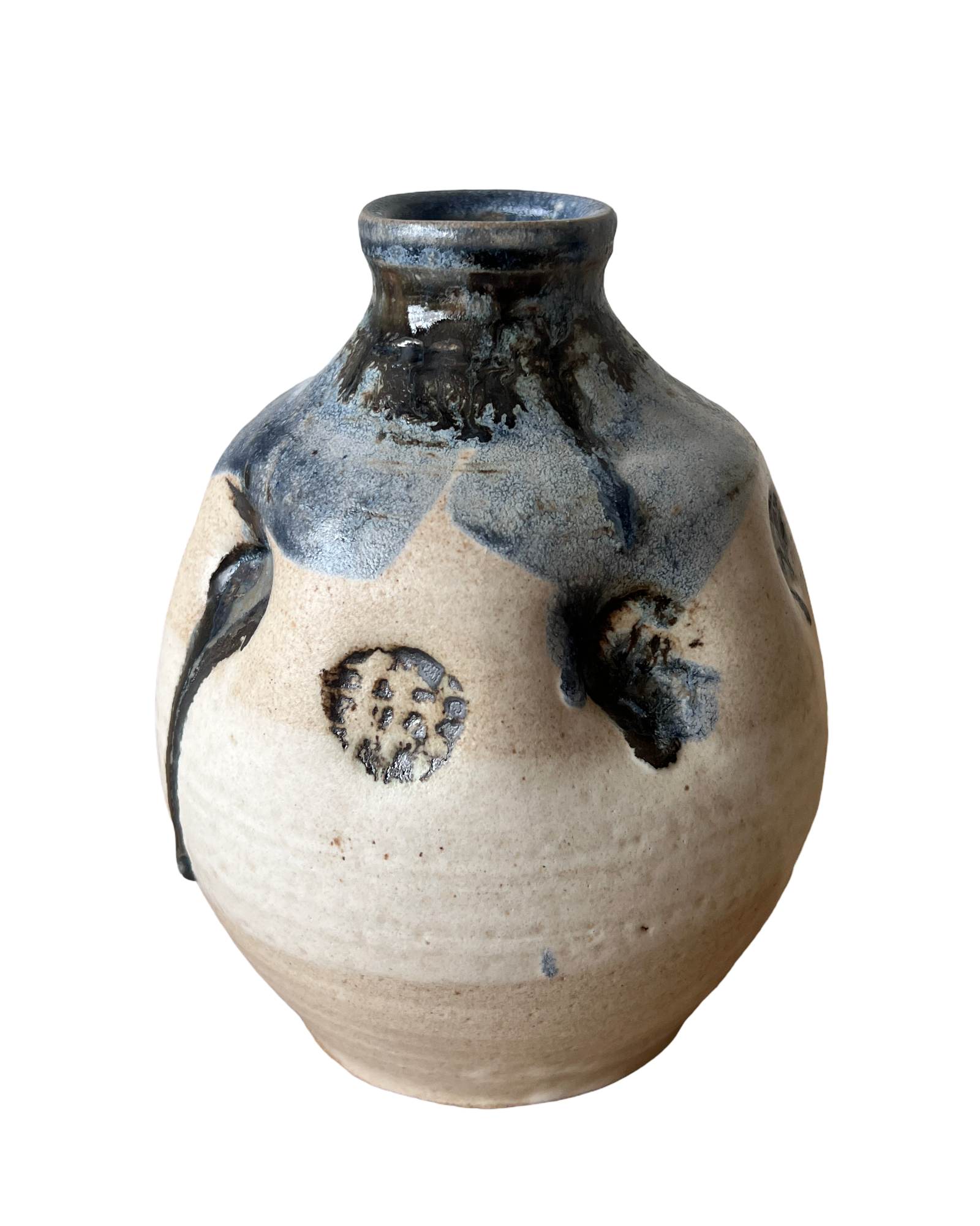 This vase may be my favorite from the current shop update. It was was crafted from rich brown stoneware clay. Its glazed in salt white glaze for the interior and lip and then that was double dipped wood ash glaze with cobalt blue added. Wood ash glazes are meant to be thicker and sometimes even a little "crusty". Its unpredictable making each piece truly a one of a kind piece that can't be duplicated. There is a bronze glaze added as well. It is watertight.