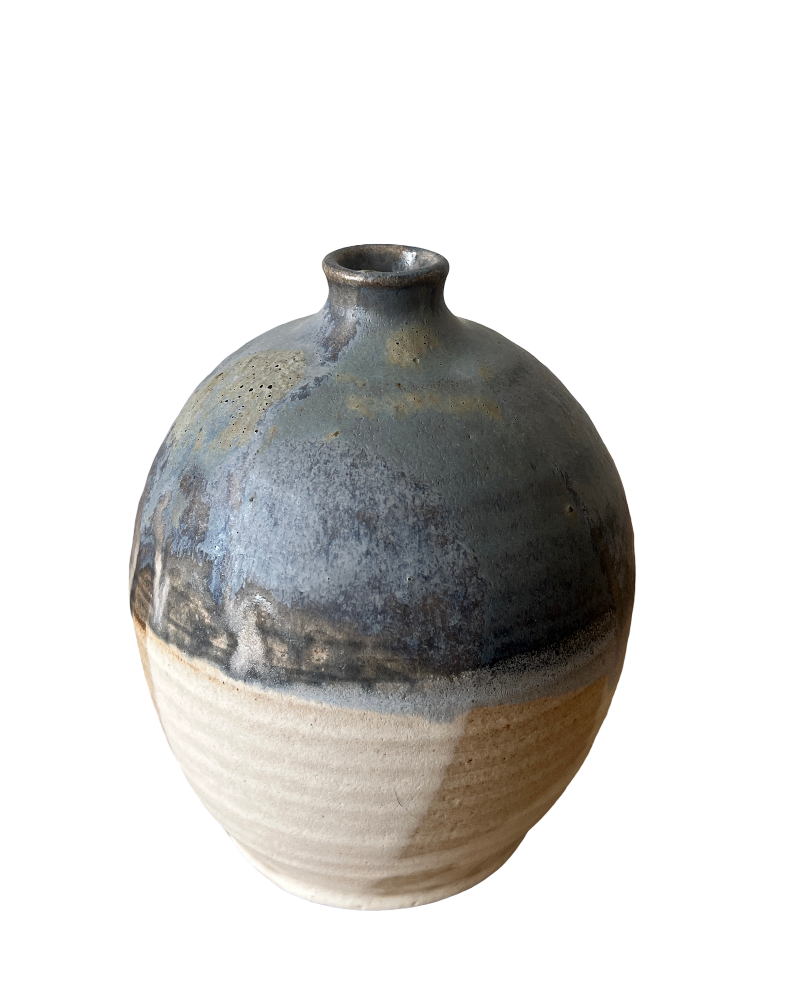 This vase was was crafted from rich brown stoneware clay. Its glazed in sand glaze for the interior and lip and then that was double dipped wood ash glaze with cobalt blue added. Wood ash glazes are meant to be thicker and sometimes even a little "crusty". Its unpredictable making each piece truly a one of a kind piece that can't be duplicated. It is watertight.